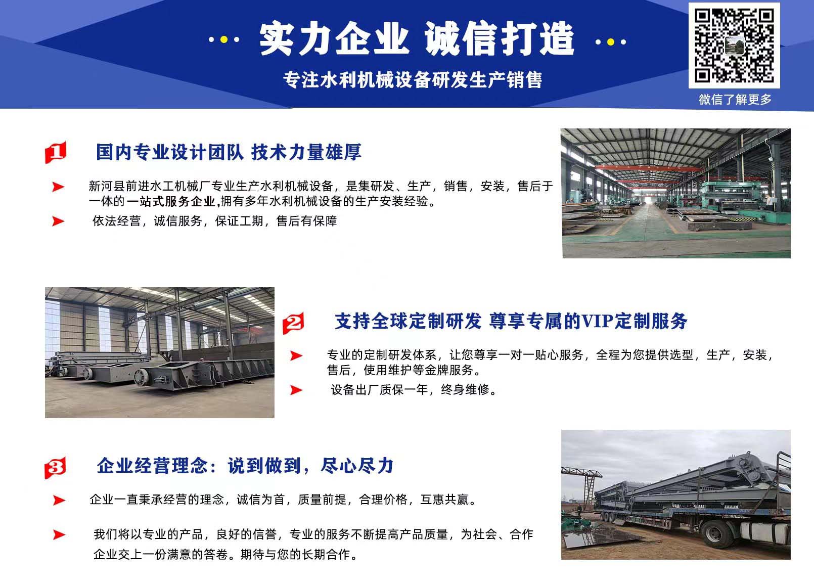 新河縣前進水工機械廠是一家專門從事水利工程設(shè)備研發(fā)生產(chǎn)的廠家,現(xiàn)有員工228人,各類高、中級專業(yè)工程技術(shù)人員近30人,技術(shù)生產(chǎn)工人180多人。公司占地面積14674平方米。公司擁有車、鉗、刨、銑、冷作、鈑金、鑄造等,工種齊全,加工能力和技術(shù)力量雄厚,并具備理化測試手段與儀器設(shè)備。前進水工專注景觀閘門,鋼壩,合頁壩,液壓升降壩,液壓閘門,臥倒門,一字門,人字門,液壓啟閉機,卷揚啟閉機,螺桿啟閉機,清污機,除污機,閘門,拍門等設(shè)備的研發(fā)與生產(chǎn),是新河水利工程產(chǎn)品行業(yè)的領(lǐng)跑者,不僅在同行業(yè)群中揭起了一次又一次的技術(shù)革新,更為水利工程企業(yè)提供了更高更大的選擇平臺。